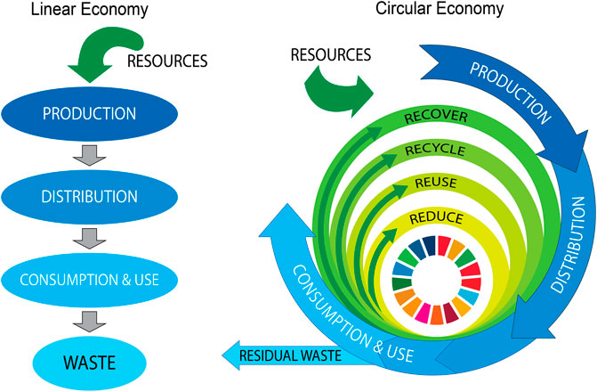 Figure 1. Linear economy versus circular economy. Adapted with permission from Ref. Khajuria and Verma (2025). Copyright 2025, Khajuria and Verma.