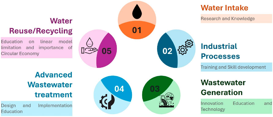 Public-private partnerships (PPPs) can play a significant role in creating alternative water reuse schemes and optimizing urban water management. Additionally, the development of fit-for-purpose water regulations and financial incentives can encourage the adoption of water reuse practices in industries (Caucci and Ozkul, 2024). By embracing these circular economy principles, industries can significantly reduce their water footprint, minimize environmental impacts, and potentially reduce operational costs associated with water use and treatment. Education is the linchpin that enables these circular strategies to take root and flourish. Comprehensive training and capacity-building programs equip industry professionals with the technical, managerial, and collaborative skills needed to design, operate, and continuously improve circular water systems. By promoting a culture of innovation and systems thinking, circular economy education ensures that best practices are disseminated, public acceptance of water reuse is strengthened, and a new generation of leaders is prepared to drive the transition toward water-secure, resilient industrial economies.