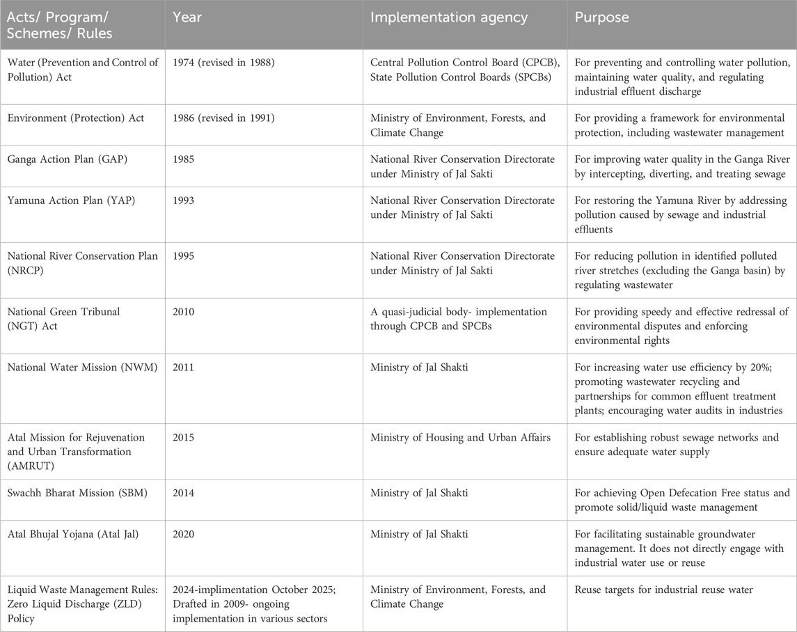 India faces significant challenges in developing its wastewater management infrastructure, particularly in urban and industrial areas. The gap between wastewater generation and treatment capacity is stark. Indian cities produced approximately 72,368 million liters per day (MLD) of wastewater in 2021–2022, but the installed treatment capacity was only 31,841 MLD—just 44% of the total generated (Central Pollution Control Board, 2022a). Furthermore, only about 28% of this wastewater is treated as many facilities operate below optimal standards (NITI Aayog, 2022). Furthermore, of the 28 states, only 11 have formulated wastewater reuse policies; however, the majority of these policies lack well-defined implementation plans, sustainable financing mechanisms, and comprehensive monitoring frameworks (Singhal and Ahmad, 2025). This shortfall contributes to environmental pollution and intensifies water scarcity, especially as industrial and urban demands continue to rise. India has established legal frameworks, policy and programs for wastewater management and reuse for both residential areas and industries as shown in Table 1. The Water (Prevention and Control of Pollution) Act, 1974, and the Environment (Protection) Act (EPA), 1986, serve as the foundational legislation underpinning all policies, programs, and schemes related to water and wastewater management in India. Despite the significant contribution of industries to water pollution, industrial wastewater reuse has yet to receive adequate policy attention in India. Most of these programs and schemes are oriented towards residential wastewater management, for example, Atal Mission for Rejuvenation and Urban Transformation, Swachh Bharat Mission and Atal Bhujal Yojana.