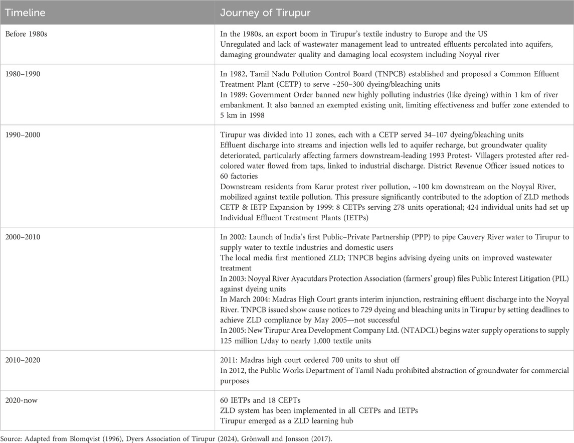 India is the sixth-largest exporter of textiles and apparel in the world, contributing 8.21% to the country’s total exports in 2023–2024. The textile industry contributes 14% of total industrial production and provides direct employment to over 45 million people while indirectly supports the livelihoods of more than 100 million, including a significant number of women and members of the rural population (Christian et al., 2023). The textile industry uses 170.34 MLD of water and releasing wastewater containing dynes, pigments, heavy metals and other complex pollutants directly into environment (Christian et al., 2023). This underscores the challenges, resistance, and successful implementation of ZLD in the Tirupur textile industry. This transformative journey has evolved from higher freshwater consumption and the discharge of untreated toxic wastewater to an advanced approach of sustainable industrial wastewater management (Grönwall and Jonsson, 2017; Gupta, 2022).