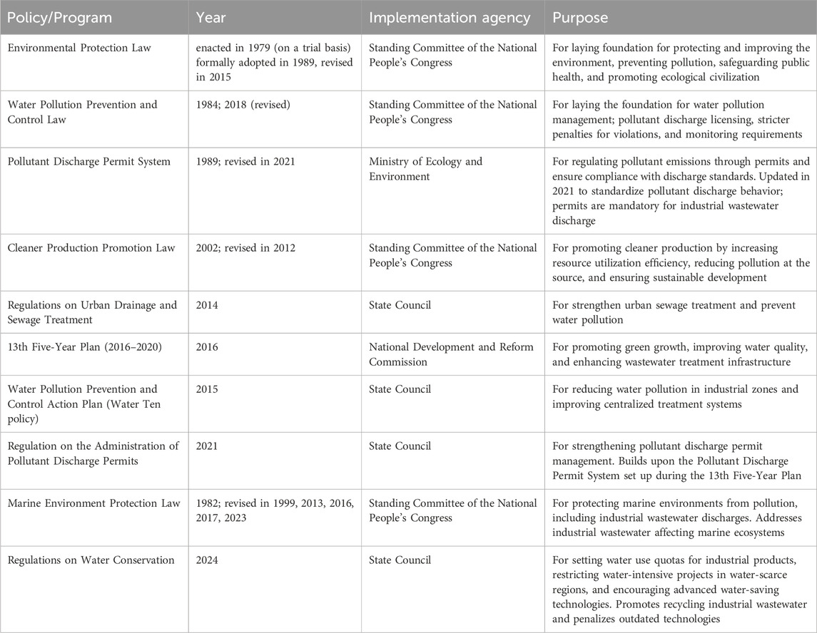 China has made significant investments in wastewater treatment and has enforced policies and programs to promote wastewater reuse and improve water efficiency. The foundation for wastewater management was established with the Environment Protection Law of 1979 and the Water Pollution Prevention and Control Law of 1984. The National Environmental Protection Bureau (now the Ministry of Ecology and Environment) was established in the 1980s under the Environment Protection Law as a central agency responsible for formulating policies and enforcing environment related legislation (Zhang et al., 2023). The detailed legal framework and policies for wastewater and reuse of China is shown in Table 3. With the increased scale and intensity of industrialization, more targeted effluent discharge standards were issued and implemented (Zhang et al., 2023). Recently, Regulations on Water Conservation were introduced to ensure sustainable water use, especially in water-scarce regions and high-consumption industries. These regulations set quotas, promote efficiency, and enforce penalties for wasteful practices (State Council, 2024).