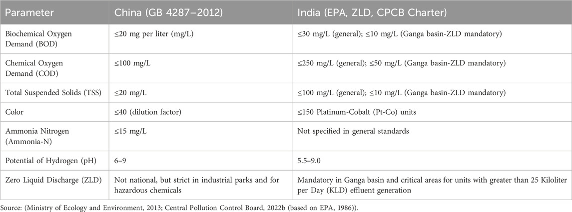 Furthermore, a closer examination of the textile sector in both countries reveals marked differences in wastewater standards, particularly in terms of regulatory stringency and thematic priorities. China enforces strict, sector-specific standards (GB 4287–2012) that set low limits on pollutants like Biochemical Oxygen Demand, Chemical Oxygen Demand, total suspended solids, and colour, emphasizing pollution control at the source (Ministry of Ecology and Environment, 2013). In contrast, India lacks any sector specific standard for textile industries and relies on general standards. It emphasizes a ZLD approach mandating its implementation for large textile units situated in environmentally sensitive regions, particularly in Ganga basin Table 5. This sectoral analysis highlights China relies on stringent, sector-focused pollutant limits while India’s regulatory strategy emphasizes ZLD mandates for high-impact regions and using general standards elsewhere. India has established legal frameworks and bidding processes for industrial wastewater management and reuse; however, effective implementation is hindered by fragmented and unclear institutional responsibilities, leading to a lack of accountability and weak coordination among agencies. Moreover, policy gaps, persistent financial constraints, and technical limitations further complicate the implementation landscape, hindering the transition towards more sustainable industrial water management. While, in China, challenges such as inconsistent enforcement, financial barriers for smaller enterprises, and regional disparities in implementation have limited the overall effectiveness of their wastewater management efforts.