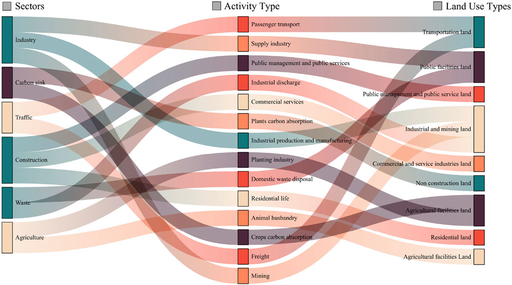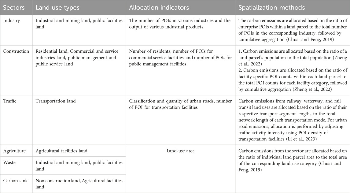 To accurately measure carbon emissions in urban territorial spaces, this study establishes a linkage between urban carbon emission inventories and land use types. First, from a consumption-based perspective, we reorganize the emission sectors outlined in the IPCC Guidelines for National Greenhouse Gas Inventories into six categories, including industry, construction, traffic, agriculture, waste, and carbon sink (Zheng et al., 2021). Next, we select spatial carriers of municipal territories and allocate carbon emission activities from these six sectors to corresponding land use types based on the spatial locations where end-use consumption activities generate emissions (Zhang Z. et al., 2023). Ultimately, we establish a municipal-level “carbon emission-territorial space” correspondence framework (Figure 3).