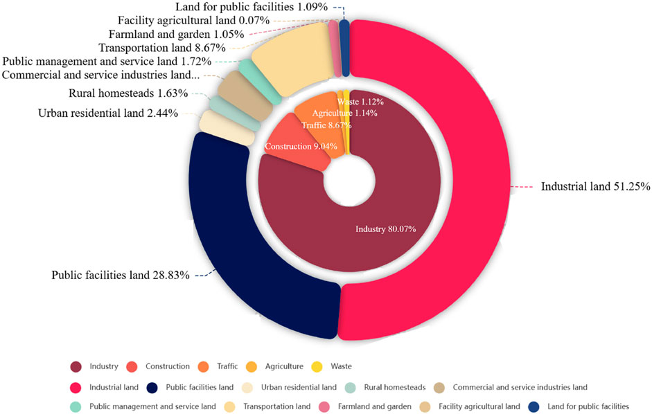 According to the carbon emission calculation method of urban sectors, the total carbon dioxide emissions in Xuzhou City for 2023 are estimated at approximately 92.2701 million tons (Table 3). The industrial sector being the largest contributor (75.1773 million tons, 81.47% of total emissions) (Figure 4), primarily originating from industrial land (48.1135 million tons, 52.14%) and public facility land (27.0638 million tons, 29.33%), reflecting the city’s reliance on traditional energy sources and a production model characterized by high energy consumption. Residential activities generate 8.4906 million tons (9.2% of total emissions), distributed across residential land (2.2925 million tons), rural homesteads (1.5283 million tons), commercial and service industries land (3.0566 million tons), and public management and public service land (1.6132 million tons). Electricity consumption is the primary emissions source of the construction sector, indicating fossil fuel dependence in power generation. The transportation sector emits 8.1415 million tons (8.82%), linked to transportation land, while emissions from agriculture (1.14%) and waste (1.12%) are comparatively minor. Xuzhou City has limited carbon sink capacity, with carbon-absorbing lands such as forests, grasslands, and water bodies collectively absorbing 1.6133 million tons.