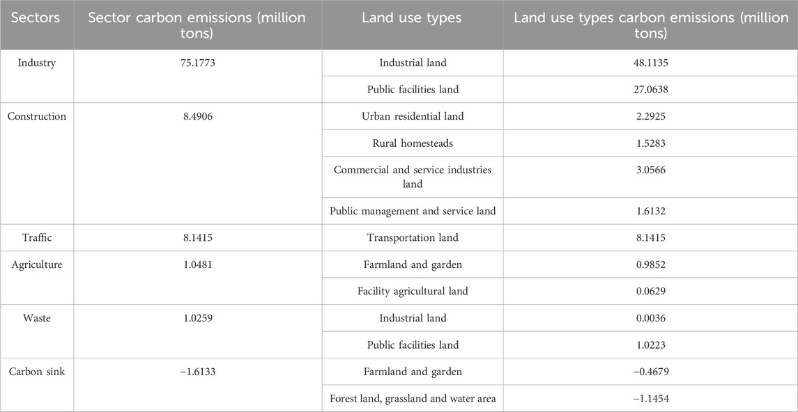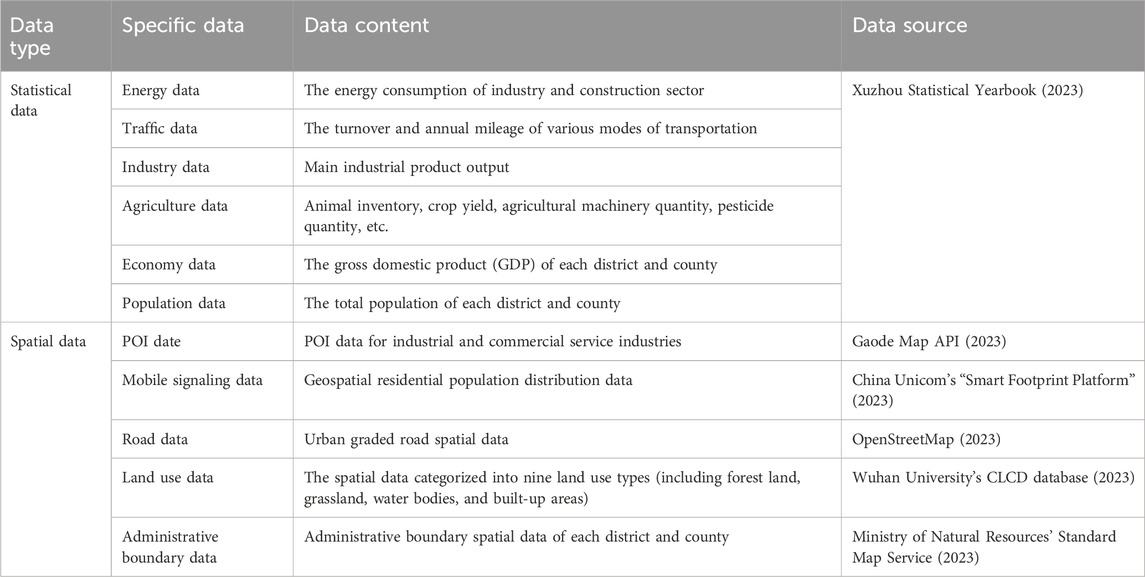 The carbon emissions from the industrial sector originate from energy consumption, feedstock use, and manufacturing processes. Industrial energy emissions are calculated based on annual industrial fuel combustion types and quantities, while process emissions derive from production volumes of key products including cement, steel, and synthetic ammonia (Hu and Man, 2023). Construction sector emissions primarily reflect building energy consumption (electricity, natural gas), estimated through energy use data and corresponding emission factors (Shi et al., 2023). For the traffic sector, emissions are determined by activity intensity and emission factors of various transport modes, with total sector emissions obtained by aggregating all modes’ contributions (Xia et al., 2020). Agricultural emissions mainly come from farm machinery operations, fertilizer applications, and land-use changes, calculated using activity intensity data and specific emission factors (West and Marland, 2002). Waste sector emissions predominantly arise from landfills, wastewater treatment and incineration activities, estimated by analyzing waste categories (organic, recyclable, hazardous) and treatment-specific emission factors (Zhao et al., 2012). Additionally, urban carbon sinks including cropland, forests, grasslands, urban green spaces and water bodies are quantified based on their areas and respective carbon absorption rates (Strohbach and Haase, 2012).