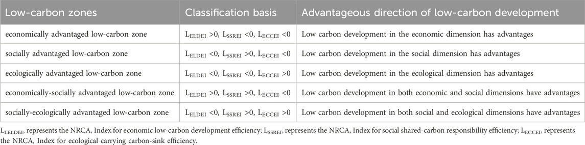 Research indicates that an NRCA Index value greater than 0 signifies that a spatial unit holds a competitive advantage in low-carbon development within a specific dimension. Conversely, a value of 0 or less indicates a lack of advantage, marking these areas as key targets for future optimization in low-carbon development. Thus, 0 serves as the threshold for all NRCA Indices. Based on the NRCA Indices in economic, social, and ecological dimensions, district and county units can be categorized into five advantage zones, namely, economically advantaged low-carbon zones, socially advantaged low-carbon zones, ecologically advantaged low-carbon zones, economically-socially advantaged low-carbon zones, and socially-ecologically advantaged low-carbon zones (Table 4).