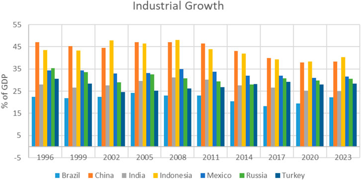 The E7 nations (China, Brazil, India, Mexico, Indonesia, Russia, and Turkey) represent some of the fastest-growing economies in the world, yet their rapid industrialization, urbanization, and resource utilization have intensified environmental challenges (Dai et al., 2024; Hassan et al., 2024; H. Liu et al., 2022; Wang and Xu, 2024). As these countries try to make their economies better, they are under more and more pressure to find a balance between growth and protecting the environment. In this case, it is important to uncover how socio-economic development and environmental resilience are linked (Imran et al., 2024; Melnyk et al., 2023; Scown et al., 2023; Terra dos Santos et al., 2023). E7 economies are pursuing growth to reduce poverty and build infrastructure, but this often makes environmental problems worse because it relies on sectors that use a lot of energy and produce a substantial carbon emissions (Alhashim et al., 2024; Ameer et al., 2024; Hao and Yang, 2024). Population growth (PG) makes these problems worse by raising the demand for natural resources and public services, which in turn raises ecological footprints (Li et al., 2024; Tal, 2025). Green innovation and efficiency gains do not change the fact that industrial growth (IG) is a major cause of pollution and resource depletion (Akram et al., 2024; Caglar et al., 2023; Cai et al., 2025).