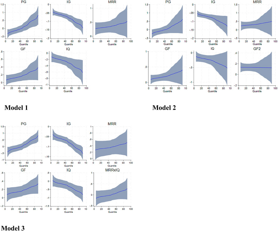 Equation 6 introduces an interaction term between mineral resource rents and institutional quality (MRR × IQ), grounded in the institutional resource-curse literature. This specification tests the conditional hypothesis that the ecological impact of resource rents depends on the strength of governance. In countries with higher institutional quality, extractive revenues may be channeled into environmentally beneficial outcomes through targeted investment, stronger environmental oversight, and reinvestment strategies. A significant and positive β6 would suggest that institutional quality moderates and potentially reverses the negative effect of resource rents on sustainability.