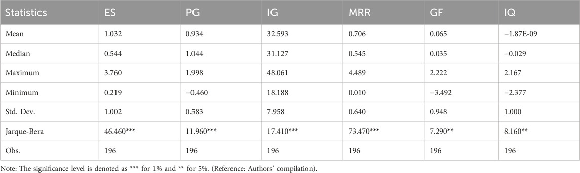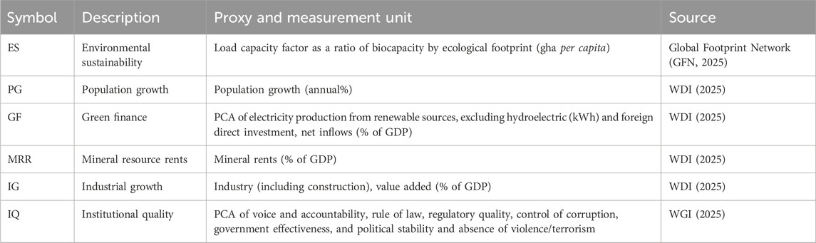 Equation 1 posits environmental sustainability (ES) as a function of five independent variables: institutional quality (IQ), population growth (PG), industrial growth (IG), mineral resource rents (MRR), and green finance (GF). This model is grounded in multiple theoretical frameworks. Population growth is included based on the IPAT identity (Impact = Population × Affluence × Technology), where increasing population directly escalates environmental pressure (Ehrlich and Holdren, 1971). Industrial growth, a component of structural economic transformation, is included due to its dual potential: it can drive resource use and emissions, but may also facilitate cleaner production technologies and green industrial policies, as suggested by the Porter Hypothesis (Porter and Van Der Linde, 2017). Mineral resource rents are included following the resource curse theory, which posits that reliance on natural resource revenues can undermine sustainable development unless managed through strong institutions and green policy frameworks (Sachs and Warner, 1995). Finally, green finance is included as a contemporary mechanism intended to bridge financial markets and environmental objectives. The theory of sustainable finance and stakeholder theory underpin its relevance, arguing that financial systems can be reoriented to support long-term environmental and social goals.