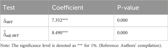 The study uses the slope homogeneity (SH) test that Pesaran and Yamagata (2008) developed to assess whether the parameter estimates might be different in various countries. This test checks if the slope coefficients are the same for all panel units. The adjusted test statistic (ΔASH) gives a more accurate result. Equations 7 and 8 provide the formulas of the ΔSH and ΔASH statistics: