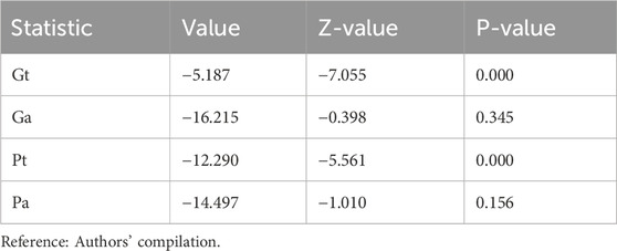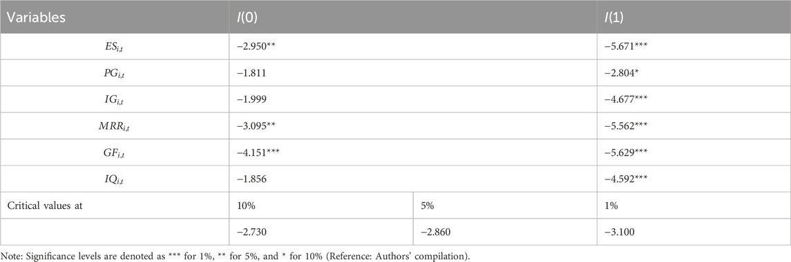 After stationarity is established, the long-run equilibrium relationship between ES and its drivers is investigated using the Westerlund (2007) cointegration test. Unlike traditional tests (e.g., Pedroni), this second-generation method accommodates cross-sectional dependence and checks cointegration through an error-correction framework. The core equation is given in Equation 11: