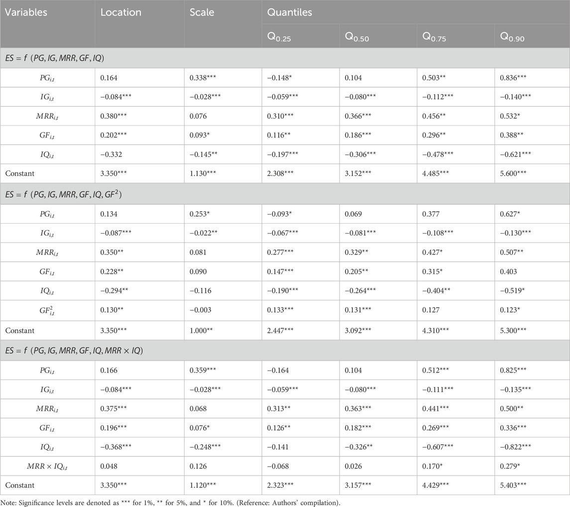 The primary estimation technique is the Method of Moments Quantile Regression (MMQR), developed by Machado and Santos Silva (2019). MMQR captures the full conditional distribution of the dependent variable, here, environmental sustainability (ES), rather than mean effects. This method is particularly suited for environmental data, where relationships may differ across quantiles (e.g., high vs. low sustainability contexts).