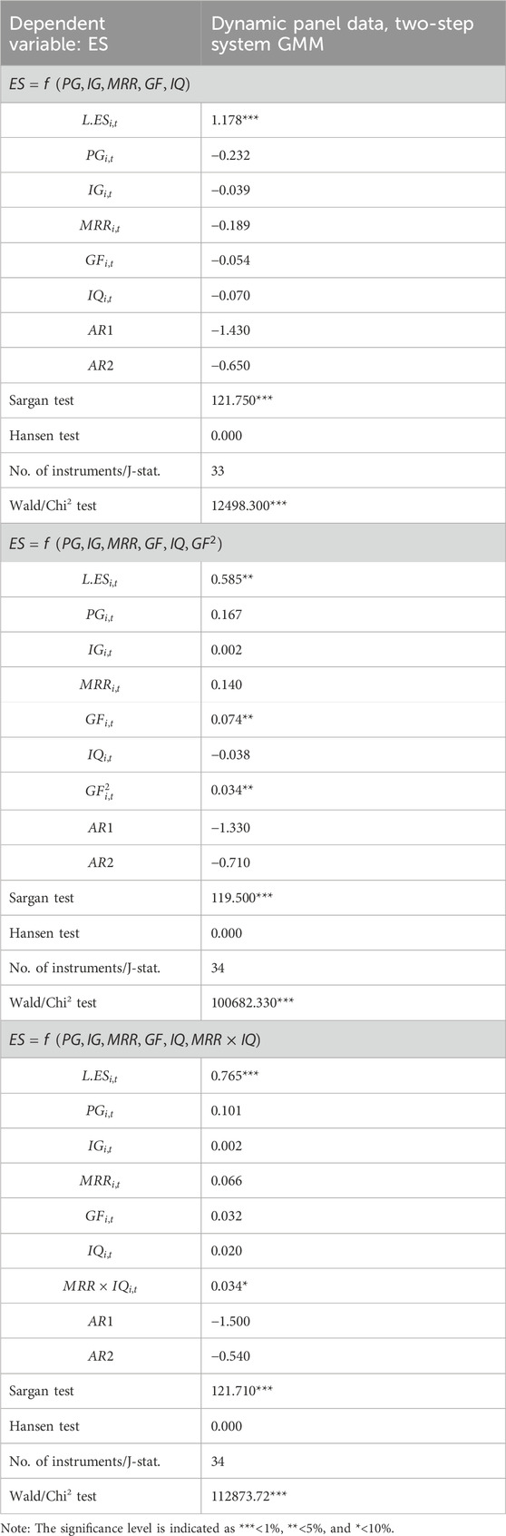 Additionally, to examine dynamic effects and further control for endogeneity, we apply a two-step System Generalized Method of Moments (System-GMM) estimator (Mawutor et al., 2024). Following the methodology of Fingleton (2022), the dynamic panel model incorporates a lagged dependent variable (ES) and instruments endogenous regressors using their own lagged values, as shown in Equation 16: