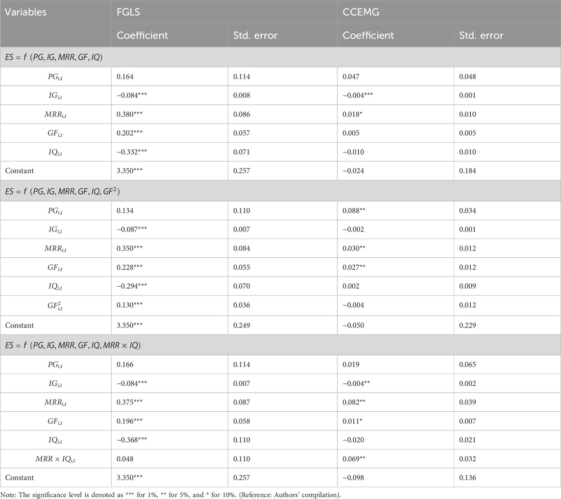 This study employs two additional robustness checks, the Feasible Generalized Least Squares (FGLS) method and the Common Correlated Effects Mean Group (CCEMG) estimator, to make sure that the MMQR results are reliable and that the estimated relationships are robust.