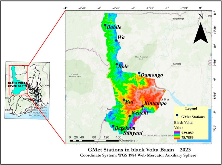 One of West Africa’s largest river basins, measuring 414,000 km2, is the Volta River Basin (Owusu and Waylen, 2009). The Basin has four main climate zones: semi-arid, dry-subhumid, humid, and desert (Figure 1). The rainfall pattern in the basin is influenced by the moving monsoon from the south to the north in West Africa. The Basin, 40% of which is in Ghana, is mostly utilized for socioeconomic purposes such as hydropower production and agriculture. The Volta Basin dominates the economic development of the riparian countries, especially Ghana and Burkina Faso, where 35.5% of the population lives and 47.6% of the population lives. The basin covers over 60% of its surface area. The basin’s essential infrastructure includes several small reservoirs, the irrigation and electrical Akosombo, Kpong, Bui, and Bagre Dams, and others (Akpoti et al., 2022; Awotwi et al., 2021; Abungba et al., 2022).
