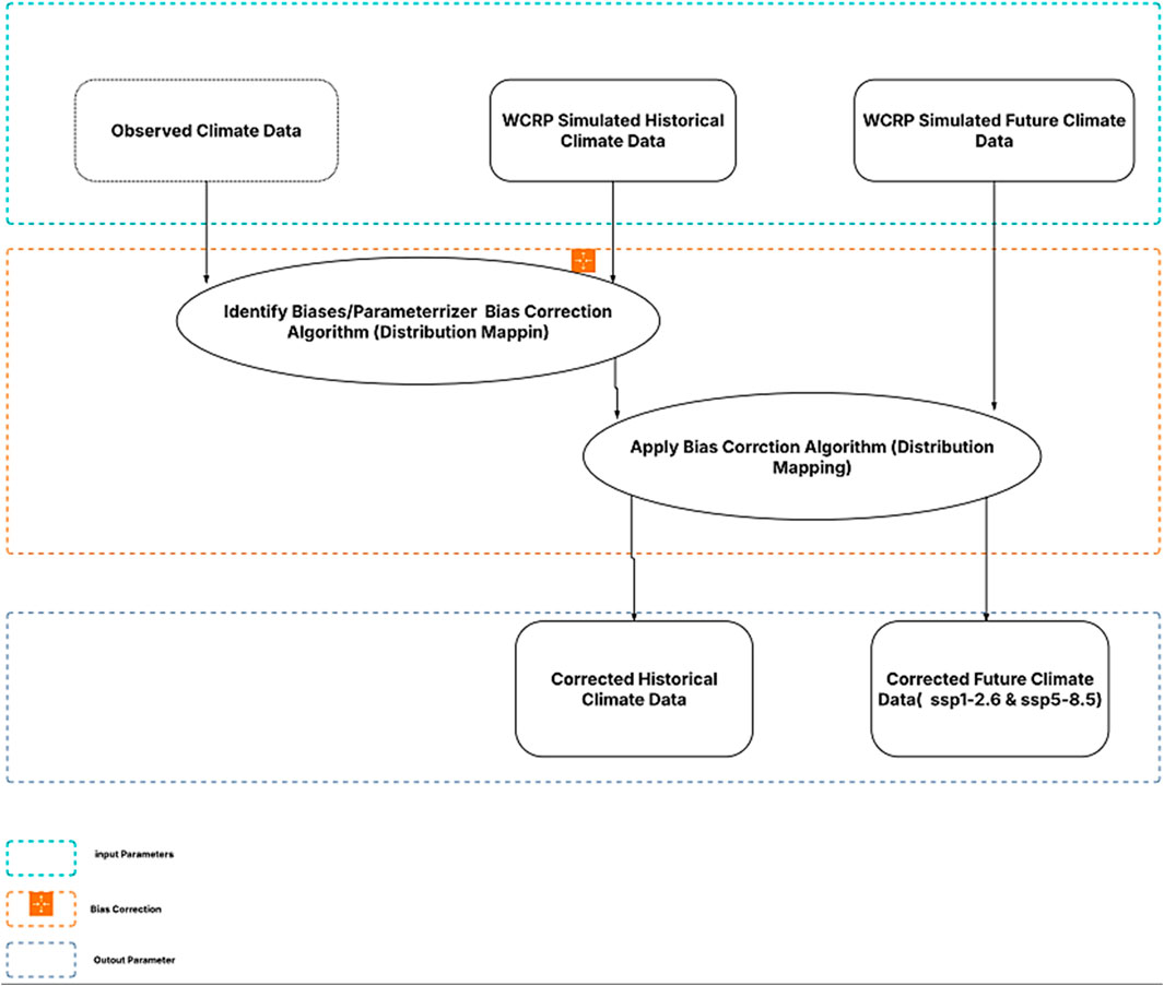 To enhance the reliability of climate projections for the Black Volta Basin, this study implemented a statistical bias correction procedure using the CMhyd computational tool (Rathjens et al., 2016). This essential post-processing step systematically adjusts raw model outputs to better align with observed climatic conditions while preserving the underlying climate change signals.