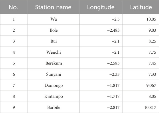 As indicated in Table 1, the Prcp, Tmax, and Tmin datasets were attained from the Ghana Meteorological Agency (GMet). The nine sites in Ghana’s BV basin serve as the basis for the data, which covers the years 1960–2016. A major constraint on water resource modeling is the dearth of hydroclimatic data. According to Yeboah et al. (2022), there are just a few climatic stations in the Black Volta Basin. Even with the data that is currently accessible, there are several gaps.