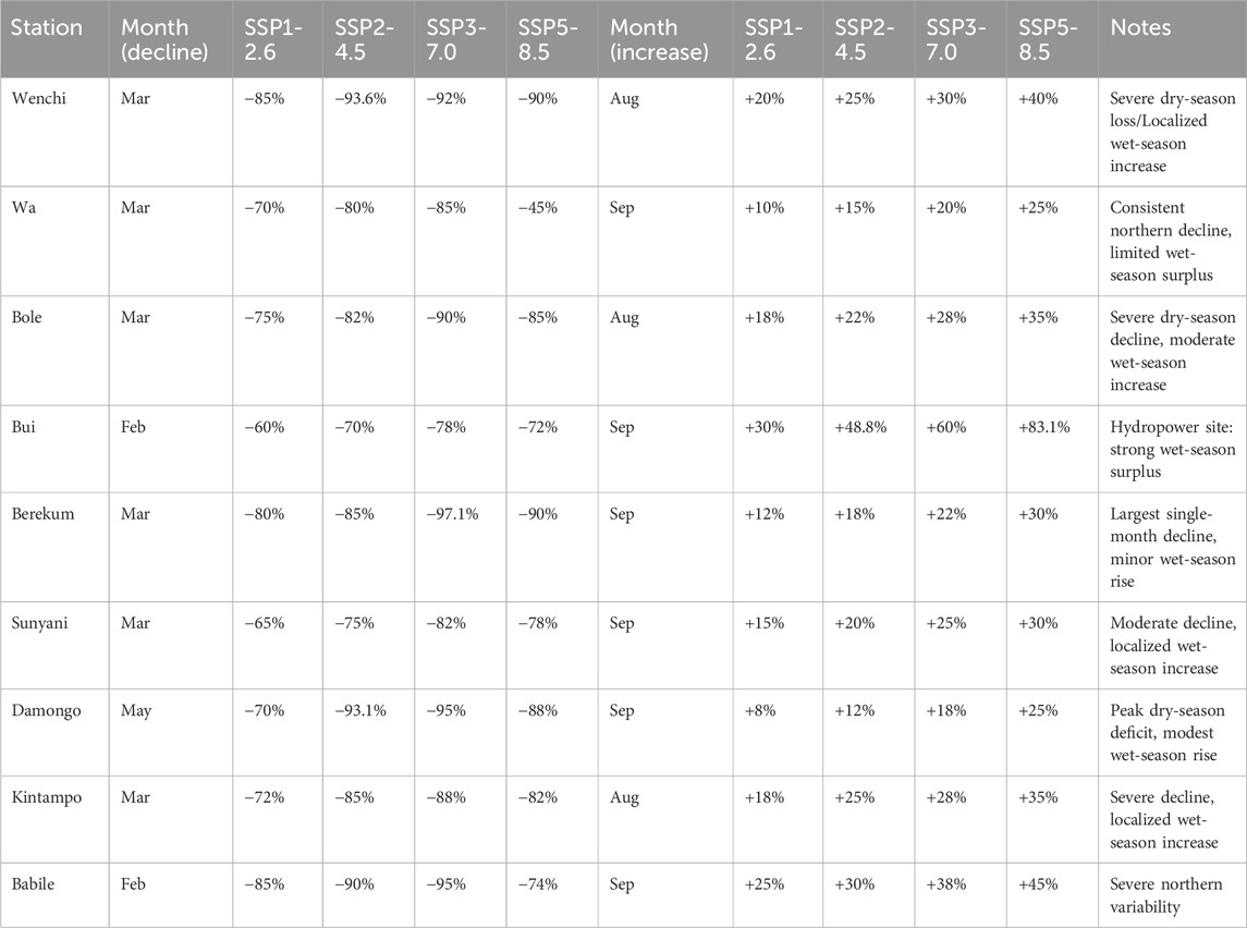 Intra-seasonal variability compounds these challenges substantially. For instance, the late dry season (February–May) experiences the most severe deficits, with reductions ranging from −60% to −97% (Table 3). Critical reductions include Berekum (−97.1% in March under SSP3-7.0), Damongo (−95% in May under SSP3-7.0), and Babile (−95% in February under SSP3-7.0), indicating delayed planting windows and potential crop establishment failure. Conversely, localized wet-season surpluses emerge, most notably at Bui (+48.8% in September under SSP2-4.5, reaching +83.1% under SSP5-8.5). While these surpluses may support hydropower generation and soil moisture replenishment, they simultaneously increase risks of flooding, soil erosion, and water management complications.