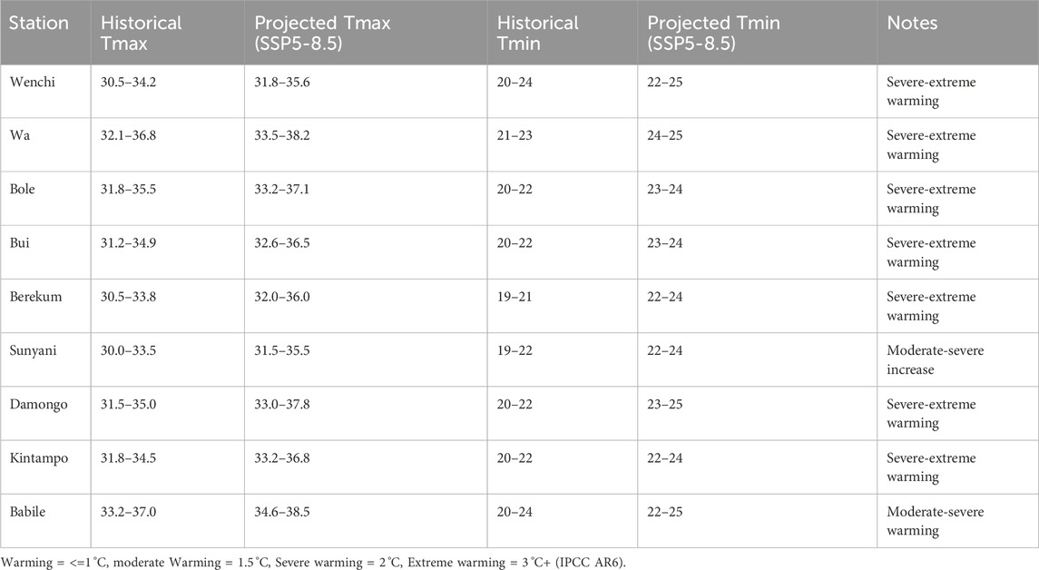 Global temperature projections indicate an increase of 0.3 °C–4.8 °C by the conclusion of the twenty-first century, with regional variations contingent upon local climatic conditions and emission scenarios. Ghana, positioned within the West African region, confronts multidimensional climate vulnerabilities that significantly impact agricultural systems, water resources, energy infrastructure, and public health (Duku and Hein, 2021). The heightened susceptibility of sub-Saharan Africa to alterations in temperature and precipitation patterns is particularly evident in the Black Volta Basin, where Shared Socioeconomic Pathway (SSP) projections indicate temperature increases of 3.0 °C–5.0 °C by 2050 relative to the 1976–2014 baseline period.