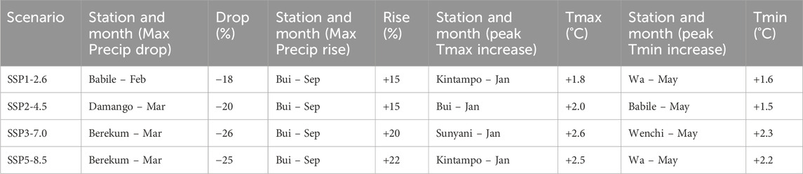 Table 5 presents the summary of the projected climate changes by 2050. Across all SSP scenarios, the Black Volta Basin is projected to experience substantially drier dry seasons, more intense wet seasons in specific locations, and a consistent rise in both maximum and minimum temperatures by 2050.