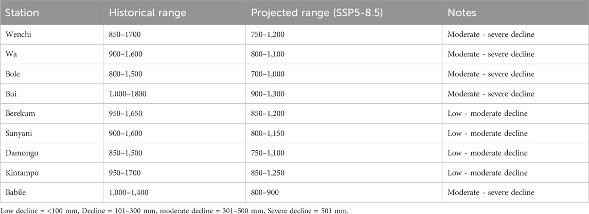 Wenchi, historically receiving 850–1700 mm of annual rainfall, is projected to decline to 750–1200 mm, while Wa is expected to drop from 900–1600 mm to 800–1100 mm annually. Bole follows a similar trend, falling from 800–1500 mm historically to 700–1000 mm under future projections. Bui, a critical hydropower station, may see rainfall decrease from 1000–1800 mm to 900–1300 mm, potentially affecting reservoir recharge. Further south, Berekum and Sunyani are projected to experience reductions from 950–1650 mm and 900–1600 mm to 850–1200 mm and 800–1150 mm, respectively. Northern stations show more severe deficits; Damongo may decline from 850–1500 mm to 750–1100 mm, while Kintampo is projected to drop from 950–1700 mm to 850–1250 mm. Babile presents the steepest decline, with projected values of 800–900 mm under SSP5-8.5, compared to its historical 1000–1400 mm range.