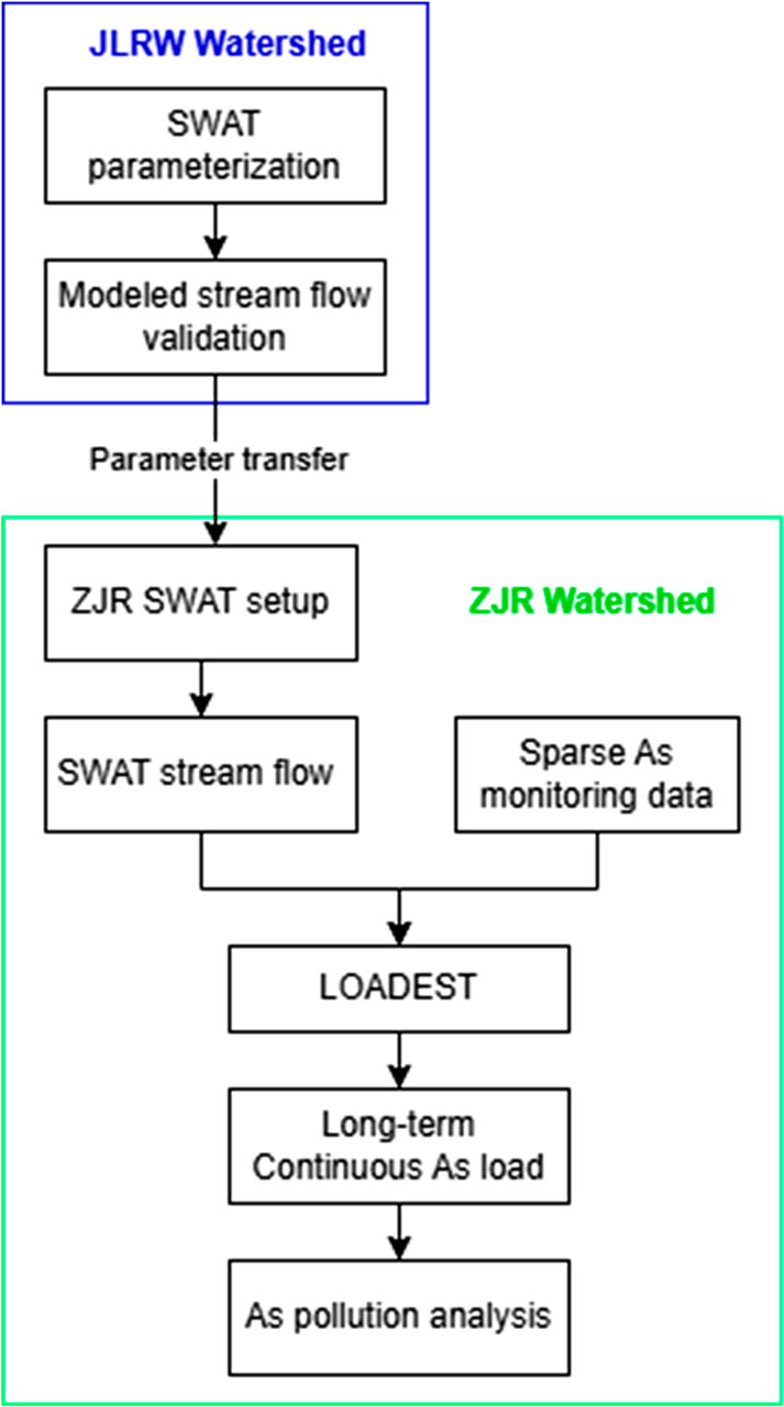 To address these challenges and to make the most of the limited monitoring data, we propose a new modeling framework that integrates the Soil and Water Assessment Tool (SWAT) and the LOADEST model. This new framework takes advantage of SWAT’s physically-based structure to enable stream flow modeling in ungauged watersheds by parameter transferring, which has been shown viable in past studies (Cheng et al., 2016; Meng et al., 2020; Roth et al., 2016). In addition, LOADEST employs the sparse water quality monitoring data to provide a reliable prediction of the stream pollutant load (Du et al., 2019; Petach et al., 2021; Shrestha et al., 2020; Shu et al., 2024). We apply this framework to Zhangjiang River (ZR) watershed, an ungauged watershed in southern Fujian that is subjected to the increasing threat from agricultural arsenic pollution. Our objectives are to: 1) test the viability of this new modeling framework in delivering acceptable results quantifying arsenic pollution in a data-scarce region, and 2) analyze potential sources, related factors, and the ongoing trend of arsenic pollution in the ZR watershed to support evidence-based conservation management decision-making.