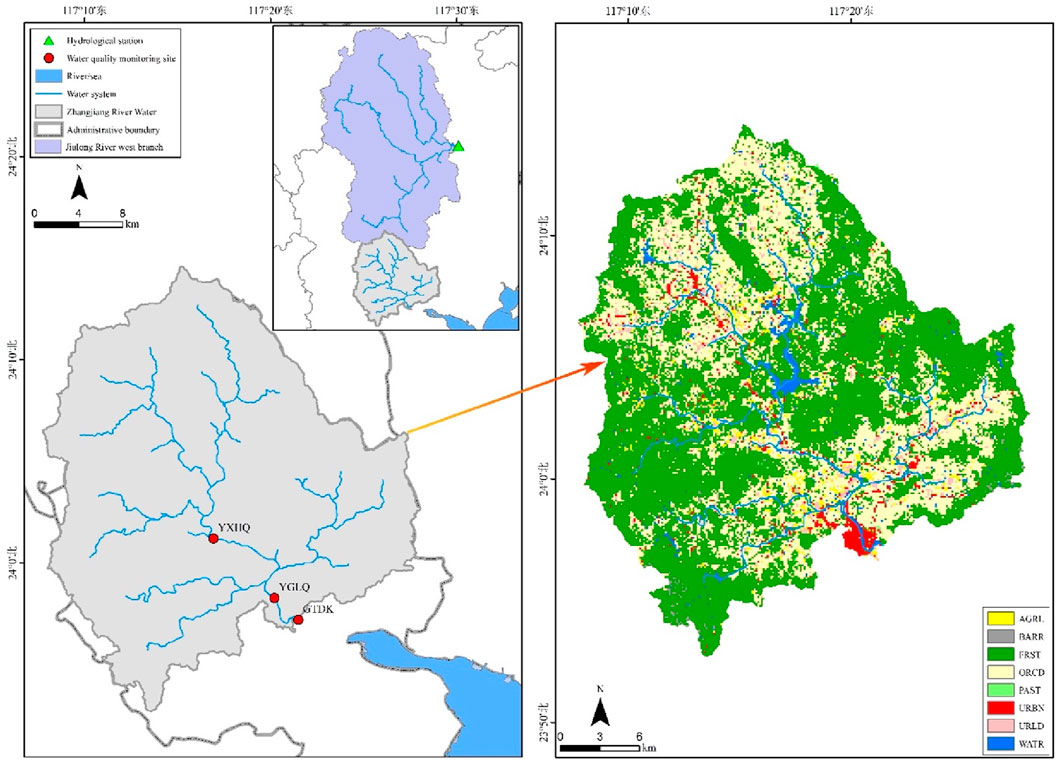 The study area of this research is the main tributary of ZR watershed, which has a drainage area of 813 km2. The ZR watershed experiences a subtropical monsoon climate with a multi-year average temperature of 19 °C–21 °C and average annual precipitation of 1,500–1,600 mm. Figure 2 shows the land use types in this area, which include developed urban area (2.2%), cropland and orchards (36.3%), and forestland (60.5%). Arsenic in ZR is derived from a mixed source of agricultural activity, animal farming, and industrial discharge. Notably, following the trend of Fujian province, the ZR watershed has also witnessed rapid growth in its animal farming sector, with an approximate 23% average annual increase in poultry numbers since 2016, reaching 1.59 million in year 2023. During the same period, pig numbers have also undergone steady growth at about 8% year-over-year. Discharging animal farming waste directly to streams is prohibited and the waste is widely recycled as manure fertilizer which leads to arsenic pollutant being introduced to cropland soils. Aside from agricultural arsenic pollution, industrial activities in Yunxiao County, including mineral processing, metal fabrication, and chemical manufacturing, may be another critical source of arsenic pollution.