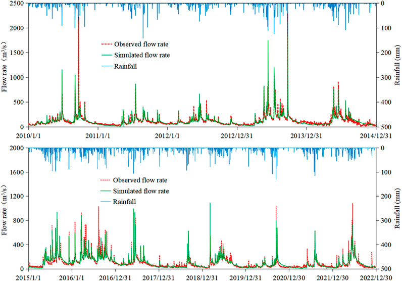 Figure 3. Comparison of measured and simulated daily flow for JLWR at Zhengdian monitoring site, for the model calibration period (2010–2014) (top) and validation period (2015–20122) (bottom).