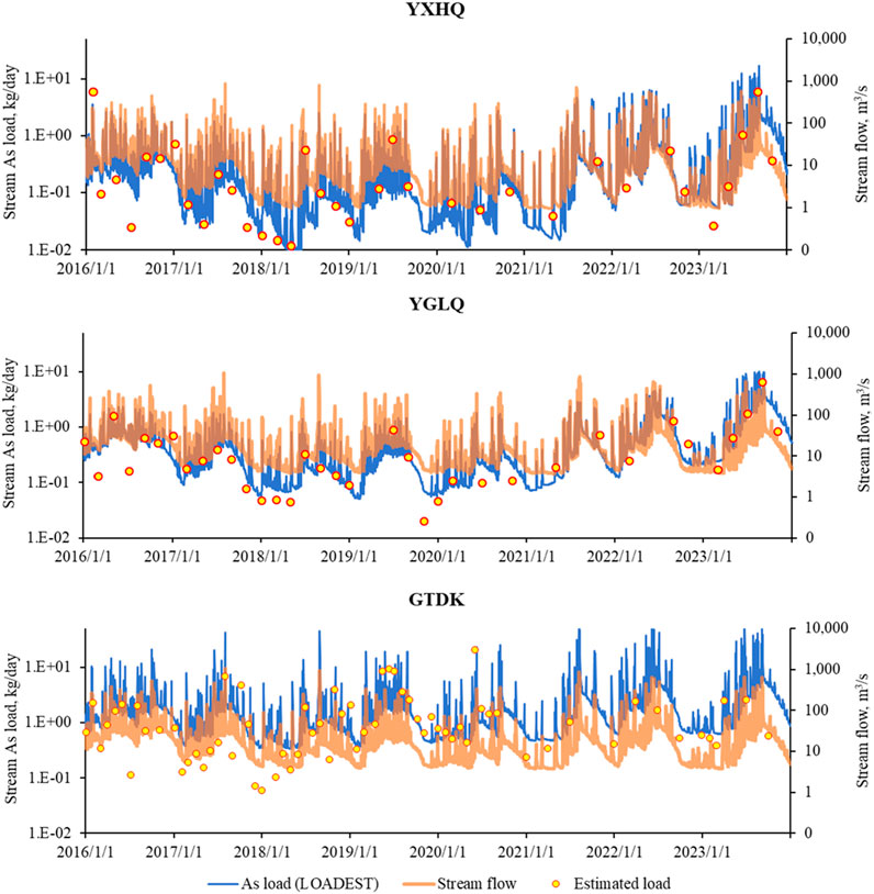 Figure 4. Modeled daily stream arsenic load in the ZR at three monitoring sites for the study period 2016–2023. Note: “As load (LOADEST) is As load calculated by LOADEST”; “Stream flow” is stream flow estimated by SWAT; “Estimated load” is As load estimated by filed monitored As concentration and stream flow estimated by SWAT.