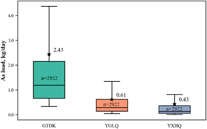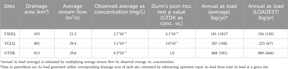 The arsenic concentration from water samples collected at GTDK was significantly higher (mean = 9.3*10−4 mg/L) than that collected at YGLQ (mean = 3.1*10−4 mg/L, Dunn’s post-hoc test p = 3.0*10−7) and YXHQ (mean = 2.7*10−4 mg/L, Dunn’s post-hoc test p = 4.1*10−8) (Table 5). The modeled multi-year average stream flow values at GTDK YGLQ, and YXHQ were 29.6 m3/s, 29.4 m3/s, and 21.2 m3/s, respectively. By multiplying the average concentration with the average stream flow, the average annual arsenic load for GTDK, YGLQ and YXHQ was estimated as 868 kg/yr, 287 kg/yr, and 181 kg/yr respectively (Table 5). Arsenic load generated within the drainage area of each site was estimated to be 581 kg/yr, 106 kg/yr and 181 kg/yr for GTDK, YGLQ and YXHQ respectively, in which the urbanized drainage area of GTDK contributed to 67% of total arsenic load (868 kg/yr) in ZR watershed.