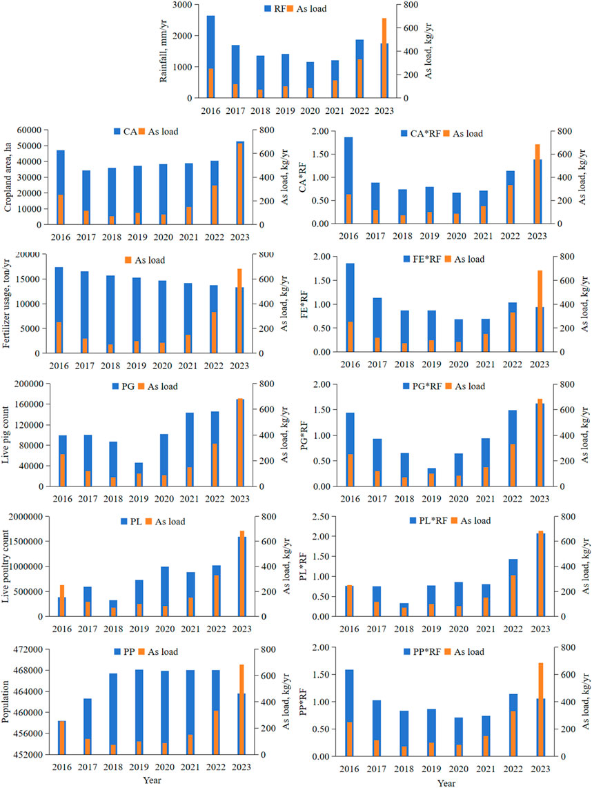 The results showed that stream arsenic load is strongly correlated to cropland area (CA) and manure factors (PG and PL), with a Pearson correlation (R2) of 0.79, 0.55, and 0.57, respectively, and a p-value less than 0.05. However, RF exhibits only a weak correlation (R2 = 0.14) with the arsenic load at YGLQ. These findings suggest that agricultural activity is the primary driver of arsenic pollution in this region, with climatic factors such as rainfall playing a secondary role. It is of note that the low R2 of fertilizer usage (FE) (R2 = 0.26) does not contradict with above statement, because of increasing usage of manure as chemical fertilizer replacement.