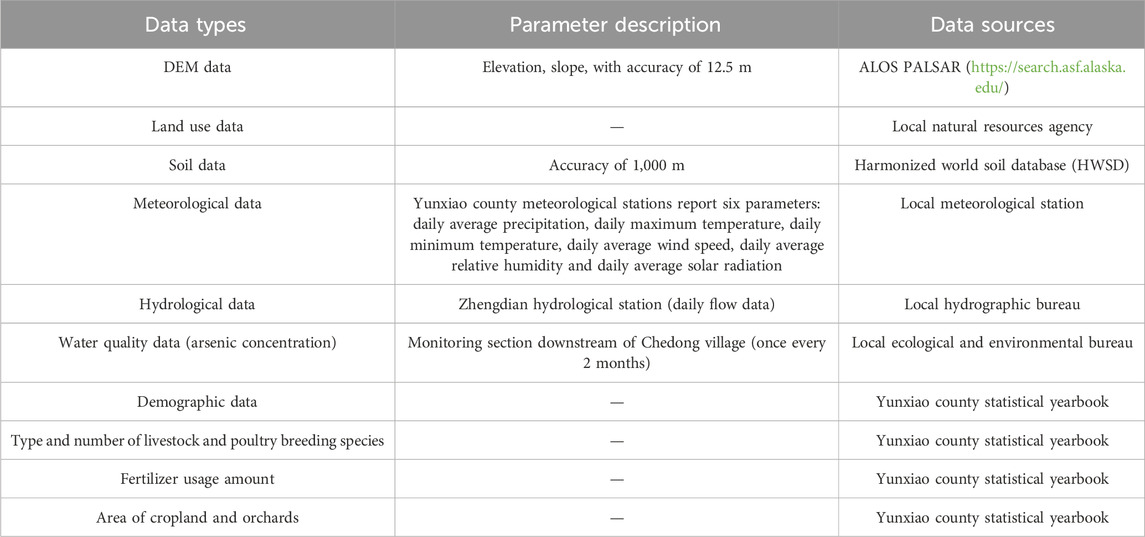 The basic data used for analysis included annual records of fertilizer usage, types and numbers of livestock and poultry, the area of cropland and orchards, and population, and they were obtained from the Yunxiao County Statistical Yearbook. Additionally, the input data required for the SWAT model included meteorological, land use, soil, hydrological, and Digital Elevation Model (DEM) data. The sources of these data are listed in Table 2.