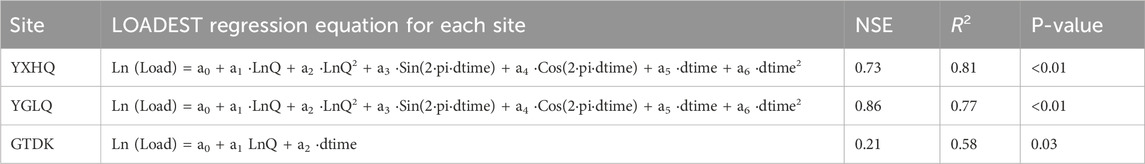 LOADEST was applied to arsenic concentration data collected at the three sites along main channel of ZR (GTDK, YGLQ and YXHQ) for the study period 2016–2023, and an overall reasonable model performance of the modelled daily arsenic load was reported, with NSE values of 0.21, 0.86, and 0.73, and R2 values of 0.58, 0.77, and 0.81, respectively, for the three mentioned sites (Table 4). The GTDK site is located at the downstream part of ZR close to watershed outlet, and it is subjected to the impact of urban runoff and industrial discharge from the urbanized part of Yunxiao county (Figure 2), while the rest of watershed represented by YGLQ and YXHQ is predominantly impacted by agricultural diffuse arsenic sources. This may have adversely affected the performance of LOADEST at GTDK.