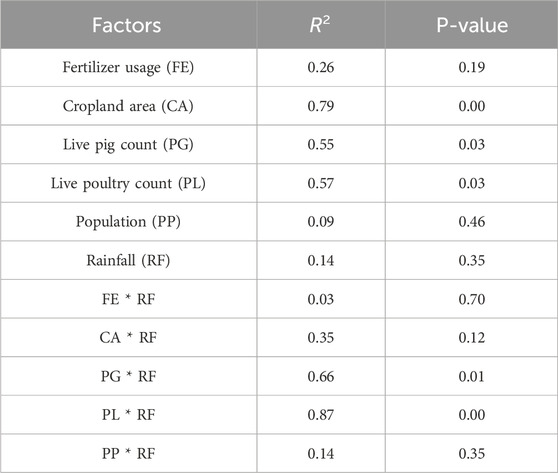 Although a significant part of the in-stream arsenic load is derived from point sources in the urban part of the ZR watershed, diffuse arsenic pollution from the vast rural area is still important because expanding agriculture is becoming a major source of diffuse arsenic pollution which is on the rising trend. For an in-depth analysis, the annual estimated arsenic loads at YGLQ were compared to selected potential factors to investigate the cause of the rising trend in diffuse arsenic pollution. The factors investigated included annual fertilizer usage (FE), crop land area (CA), live pig count (PG), live poultry count (PL), population (PP), and annual rainfall depth (RF). It’s worthy pointing out that PG and PL were included not merely as indicators of livestock production but because of their direct link to cropland arsenic contamination. Local policies promote the use of animal manure as replacement for chemical fertilizers regardless of actual receiving capacity of cropland soil, leading to the accumulation of arsenic (widely used as feed additive) in agricultural soils. Considering that current regulations do not require arsenic removal in animal waste handling for manure production, it’s reasonable to assume that the amount of arsenic pollutant returning to soil with manure subjected is proportional to the number of animals raised in the studied area. Thus, PG and PL also serve as indicators to the usage of arsenic-rich manure, and will be referred to as the manure factor. The interaction terms between selected individual anthropogenic factors and rainfall depth were also investigated, and these included fertilizer usage and rainfall depth (FE × RF), crop area and rainfall depth (CA × RF), live pig count and rainfall depth (PG × RF), live poultry count and rainfall depth (PL × RF) and population and rainfall depth (PP × RF). Using FE × RF as an example, these interaction terms were computed by normalizing each variable by its mean and then calculating their product. Data from YGLQ were selected, because the GTDK site is subjected to the influence of urban and industrial point sources, which resulted in a poor LOADEST model performance.