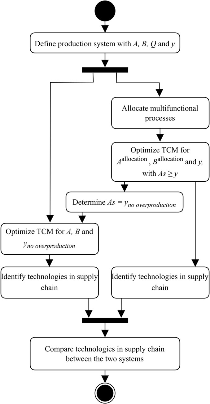 A product-wise optimization of technology alternatives equals the approach that uses standard computational structure of LCA (see Equation 1), in which different options to produce one product or provide one service are compared. Equation 1 is solved multiple times, with different technologies considered in each calculation. As indicated, difficulties might arise when one or more processes are multifunctional. Multifunctional processes connect the supply chains of different products. To disconnect supply chains one has to solve the so-called multifunctionality problem. To solve the multifunctionality problem, the ISO norm standardizing LCA, ISO 14044 (International Organization for Standardization, 2020a), prescribes a three-step procedure: