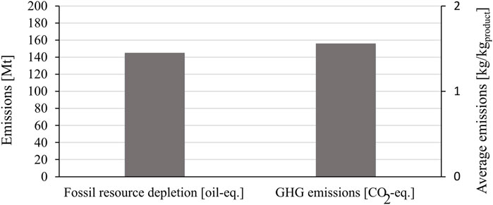 The results of our case study show that in a product basket-wise optimization 43 production processes are selected to produce 24 chemicals, 22 of which are multifunctional processes. These 43 processes combined produce the final demand while they determine the lowest amount of GHG emissions. All processes not selected are suboptimal for the combination of our production system and final demand. This might have two reasons: (1) single technologies perform worse in comparison to the selected technologies and (2) the amount or proportions of by-products and their usability within the production system are disadvantageous. Cumulated results in Figure 5 show 144 Mt oil-equivalents and 155 Mt CO2-equivalents are consumed and emitted to produce the final demand in Europe for the year 2016 (European Commission, 2019).