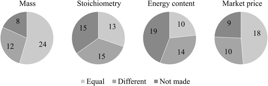 Figure 6. Amount of technology decisions that are equal, different or not made in comparison between a product-wise optimization, with allocation based on either mass, stoichiometry, energy content, or market price, and a product basket-wise optimization for European demand.
