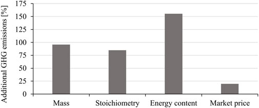 Figure 8. Additional GHG emissions in product-wise optimization - with allocation based on either mass, stoichiometry, energy content, or market price - compared to product basket-wise optimization.