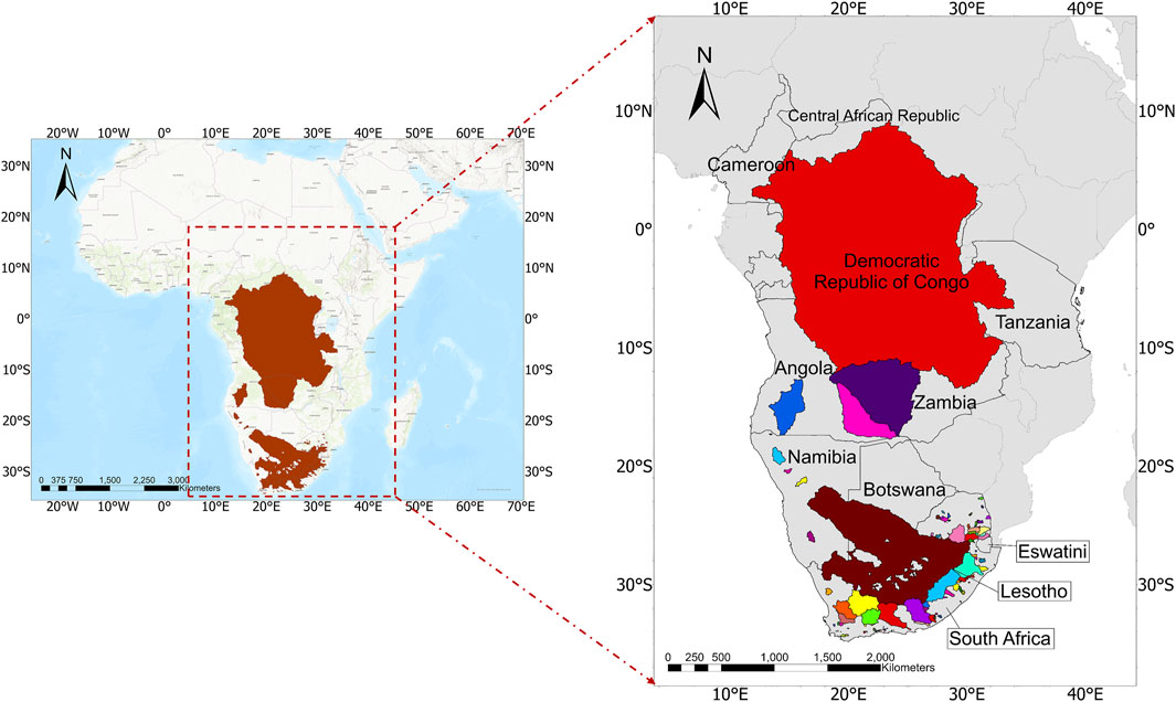 Map of Africa with a zoomed-in section highlighting sub-Saharan African countries. The Congo River Basin is shown in red. Neighbouring countries including Zambia, Namibia, Angola, Botswana, Tanzania, Cameroon, Central African Republic, Eswatini, Lesotho, and South Africa are also displayed, along with catchments spanning these countries, in various colors. A scale bar indicates distances in kilometres.