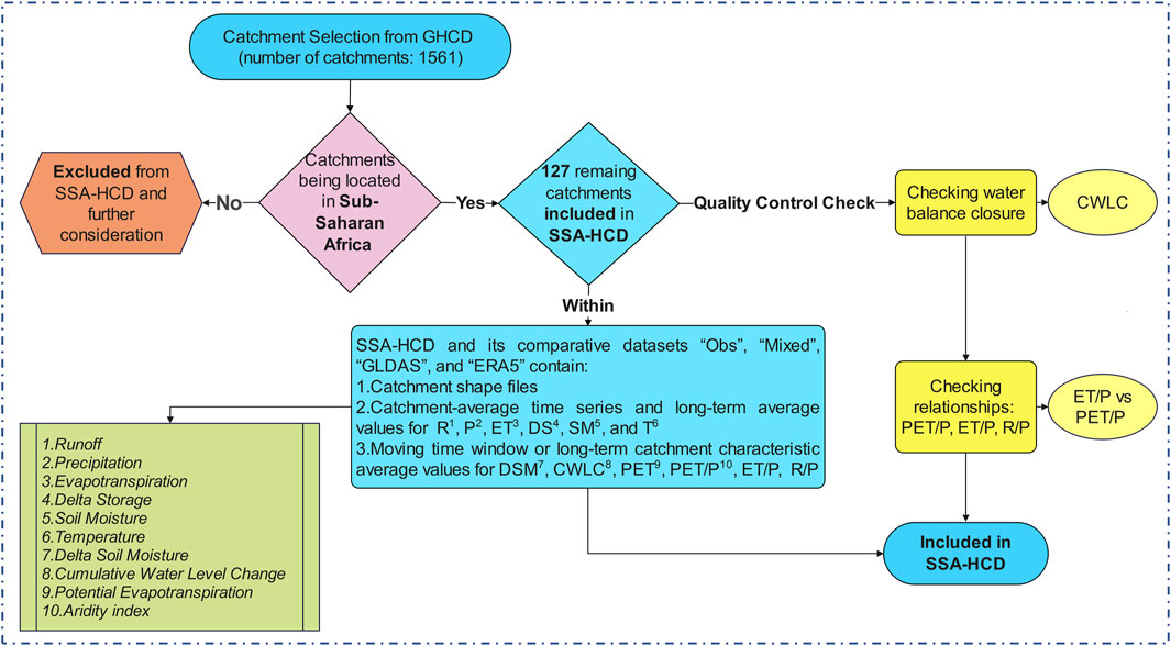 Flowchart displaying the selection and evaluation process for catchments in Sub-Saharan Africa within SSA-HCD. It begins with 1,561 catchments from GHCD. Catchments outside Sub-Saharan Africa are excluded. The 127 remaining undergo quality control checks, including water balance closure and relationship assessments. Data includes metrics: runoff, precipitation, evapotranspiration, delta storage, soil moisture, temperature, and others. Steps ensure inclusion in SSA-HCD based on criteria and checks.