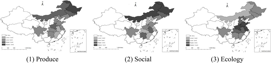 Achieving coordinated multifunctional utilization of arable land is not only an inherent requirement for high-quality agricultural development and the transition between traditional and new agricultural growth drivers, but also an important cornerstone for implementing the United Nations 2030 Agenda for Sustainable Development (Guo and Feng, 2015; Miao et al., 2021). While enhancing multifunctional land use has become a consensus around the world for promoting the sustainable use of arable land resources, several pressing challenges remain to be addressed. Firstly, the accurate assessment of multifunctional arable land utilization remains a critical challenge. Given that agricultural land use is influenced by multifaceted determinants and exhibits systemic characteristics, its multifunctional application must comprehensively reflect the quality of socioeconomic and ecological dimensions (Gao et al., 2022; Luo et al., 2012). The qualitative analysis of multifunctional arable land use remains insufficient to provide robust data support for policy formulation, only through precise quantitative measurement can the diverse functions of arable land be effectively quantified. However, current research on evaluating the performance levels of these arable land functions remains underdeveloped, limiting data-driven decision-making. Secondly, achieving synergistic interactions among the multifunctional dimensions of arable land represents a pivotal pathway to enhance its integrated utilization efficiency under current constraints. The coordination of the arable land functions, on one hand, emphasizes the endogenous nature of various arable land functions, suggesting that these functions exhibit a cause-and-effect relationship with one another. On the other hand, it places greater emphasis on the harmony and positive synergy among these multifunctional functions simultaneously (Li et al., 2021; Pang et al., 2023). In other words, coordinated interaction of multifunctional arable land implies that strengthening one particular function does not diminish others, and that different functions should exhibit mutually reinforcing or synergistic effects (Lü et al., 2023; Chai et al., 2024). Effectively discerning the intrinsic relationships—whether synergistic, trade-off, or independent—among different sub-functions of arable land is pivotal for achieving coordinated multifunctional interactions. Moreover, China’s major grain-producing, as the core agricultural region comprising 13 provinces, utilizes about 65% of the nation’s arable land while bearing principal responsibility for national food production and supply. However, this critical region simultaneously grapples with escalating environmental challenges, including excessive agrochemical inputs, worsening soil contamination, and unsustainable land exploitation practices (Zhang et al., 2021). Therefore, this paper aims to quantitatively assess the production function, the social function, and the ecological function of arable land across 13 major grain-producing provinces from 2007 to 2022, and systematically characterize the spatiotemporal evolution patterns of these multifunctional dimensions and elucidates their dynamic interrelationships, thereby providing empirical evidence and policy references for promoting comprehensive utilization and synergistic development of multifunctional arable land in these critical agricultural provinces.