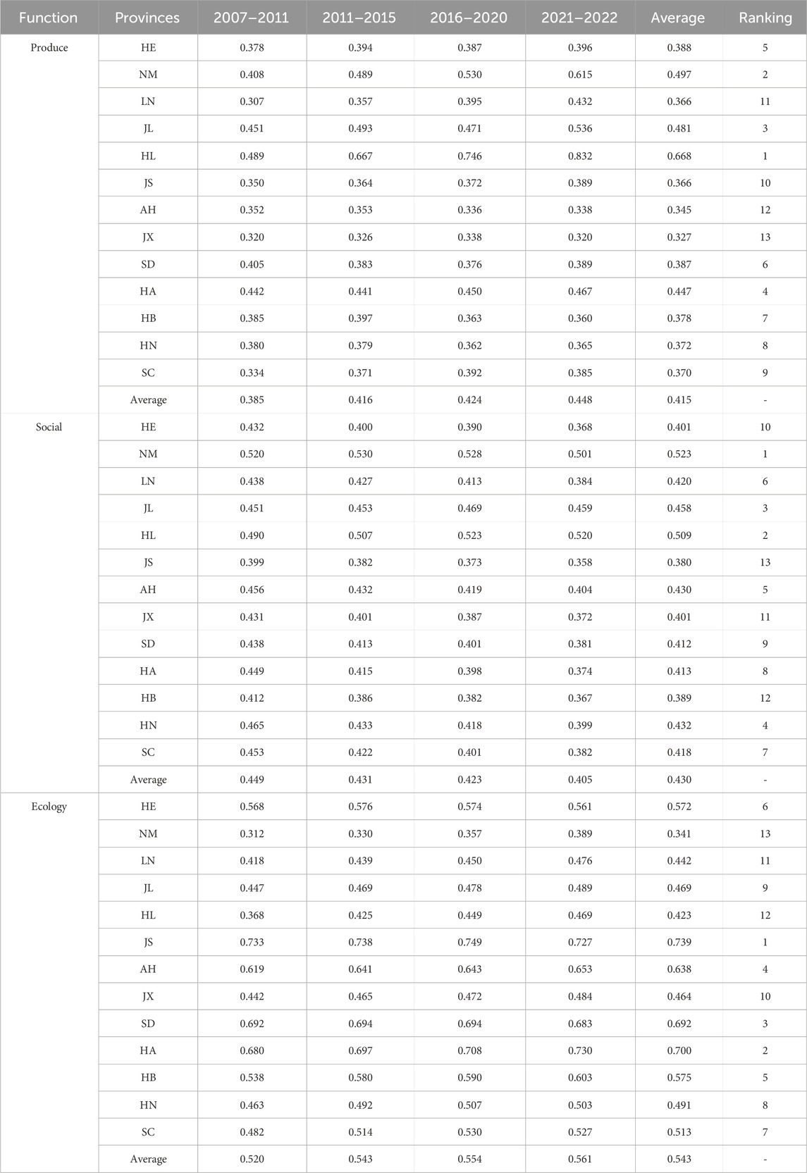 To further characterize the spatio - temporal evolution of the three functions of arable land across major grain-producing provinces, this paper adopts 5-year analytical cycles aligned with national economic planning periods, the average levels of these three functions for each region using 5-year cycle are calculated. Table 2 details the provincial-level evaluations quantify functional performance metrics and corresponding rankings of the three arable land functions. As clearly evidenced in Table 2, the disparities in the three major functions of arable land across 13 grain-producing provinces primarily manifest in three aspects. Firstly, regarding temporal evolution patterns, the arable land production, social, and ecological functions in all 13 provinces demonstrate distinct divergent evolutionary trends amid fluctuations. The four provinces of Anhui, Jiangxi, Hubei, Hunan and Shandong Province, which are situated within the middle and lower Yangtze River basi, as well as Shandong Province Shandong Province demonstrate a distinct evolutionary pattern characterized by “weakening production-social functions alongside strengthening ecological function”. This phenomenon may stem from rising household incomes in these provinces, which has shifted dietary demands from “basic sustenance” to “quality nutrition”, and market mechanisms can now meet agricultural product consumption needs, which has driven the transformation of arable land toward intensive, high-value-added agriculture, reducing local residents’ dependence on farmland and weakening its traditional role in grain production. Additionally, under the constraints of ecological and environmental factors and the trend toward creating a livable and business-friendly development environment, these provinces also have greater willingness and economic capacity to optimize the functions of farmland, leveraging roles in agricultural landscapes, air purification, water regulation, and maintaining biodiversity, thereby effectively releasing the ecological and landscape functions of farmland. In contrast, the provinces of Jilin and Heilongjiang, located on the Northeast Plain, have long invested significant resources in grain production, which has relatively low economic returns, and the state has continuously strengthened their grain production capacity through policies such as high-standard farmland construction, agricultural machinery subsidies, and grain subsidies. This has, to a certain extent, hindered the industrialization process, reduced non-agricultural employment opportunities for rural residents, and increased their dependence on farmland. At the same time, strict black soil protection policies have also made Jilin and Heilongjiang responsible for comprehensively advancing the construction of high-standard arable land, improving soil structure, and enhancing soil fertility, thereby improving the comprehensive management and utilization of farmland and achieving the coordinated enhancement of its production, social, and ecological functions.