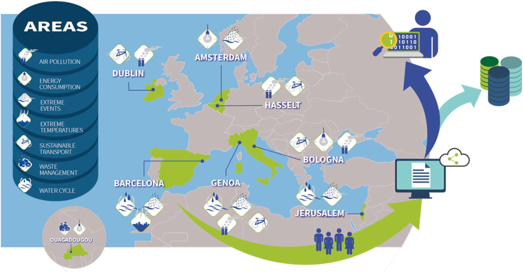 The I-CHANGE project (2022–2025) is a Horizon 2020 EU research and innovation action financed by the European Green Deal that emphasizes the role of individual and collective behavioral change in achieving a sustainable and climate-resilient future (I-CHANGE consortium team, 2021). By integrating citizen science methodologies with low-cost monitoring tools, I-CHANGE seeks to empower individuals with the knowledge and tools needed to actively contribute to climate action. The project operates through a network of eight LLs across Europe, Middle East and Africa, which function as real-world experimental environments where local communities, scientists, and policymakers collaborate on climate-related challenges. The participating LLs are located in Amsterdam (Netherlands), Bologna (Italy), Barcelona (Spain), Dublin (Ireland), Genoa (Italy), Hasselt (Belgium), Jerusalem (Israel), Ouagadougou (Burkina Faso), providing a diverse set of contexts in which to test and refine participatory climate action strategies (Figure 1). Within the I-CHANGE LLs, citizen science is employed as a mechanism to address societal challenges associated with climate change and air pollution.