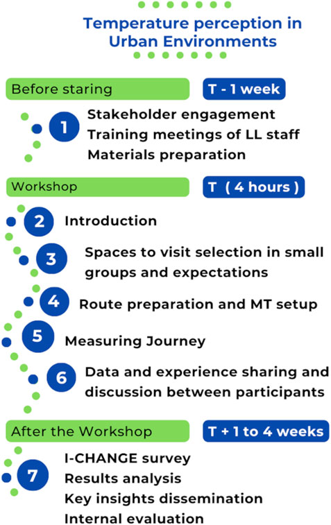 The activity was conducted as a workshop. After a presentation about the I-CHANGE project and the objectives of the activity, the participants reflected and selected the most relevant places for their everyday life on a map of the surrounding area. Divided into small groups, participants decided on the spaces to visit, classified them according to the categories corresponding to their social uses and individually filled the provided individual form with the expected temperature and relative humidity though a qualitative scale (Table 1). The participants prepared the routes and used the setup guide to configure the MT before starting the measuring journey. At each selected location, the participants added their in-situ temperature perception and the corresponding sensor measurement on the individual form and took a photograph. Back at the meeting point, a preliminary data analysis was conducted showing the online MeteoTracker platform (Meteo Tracker, 2025) and sharing the different individual forms. To conclude, each participant shared one evidence learned, one concern, one good practice in case of extreme temperatures and one proposal for improvement. Finally, the quantitative (sensor) and qualitative (perceptions, reflections) information were collected by each LL team and shared with the rest of the LLs. The details of the activity protocol and materials are described in the Supplementary Protocol S2.
