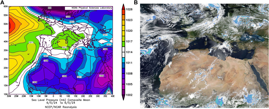 Figure 5. Synoptic situation during 5 June 2024. (A) Sea Level Pressure daily mean from NCEP-NCAR Reanalysis (source: NOAA Physical Sciences Laboratory, Boulder Colorado, https://psl.noaa.gov/). (B) Visible Infrared Imaging Radiometer Suite (VIIRS) Corrected Reflectance imagery (NASA/NOAA Suomi National Polar orbiting Partnership satellite) satellite image with the surface daily precipitation (AMSR2). Source: NASA Worldview application, https://worldview.earthdata.nasa.gov, part of the NASA Earth Science Data and Information System (ESDIS).