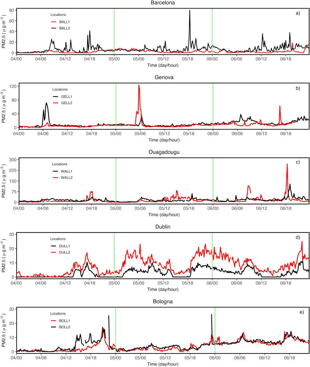 PM2.5 concentrations showed large spatial and temporal variability among the LLs during the ICD and the days before and after due to different meteorological and morphological factors at each LL. Two locations in Barcelona clearly exemplify the differences, as BALL2 recorded higher values (median 5.0 μg/m3, range 0.0–80 μg/m3), as it was located on a city center street with high traffic density, especially during rush hours. On the other hand, although BALL1 was located close to a touristic green area (park), the limited access of private cars and the larger distance to the street diminished PM2.5 concentrations (median 1.5 μg/m3, range 0.0–18.5 μg/m3). The lower limit of the range reflects the lack of sensitivity of the PMS5003 sensor for very low values, in agreement with Brattich et al. (2020). Similar differences were observed in Dublin, though without reaching such high peak values as those observed in BALL. DULL1 was installed near the Irish Sea and recorded lower values (median 2.5 μg/m3, range 0.0–11.5 μg/m3) than DULL2, which was inland in a suburban area (median 7.0 μg/m3 range 0.0–25.9 μg/m3). The highest values were recorded in Ouagadougou (median 7.0 μg/m3, range 0.0–269.5 μg/m3 in WALL1 and median 14.0 μg/m3, range 0.5–128.5 μg/m3 in WALL2), probably related to drier conditions combined with occasionally local surface-level instability and traffic, which can raise the dust due to the unpaved roads, allowing the resuspension of dust particles (Nana et al., 2012). These conditions are typical of the dry pre-monsoon phase in the region (Bou Karam et al., 2009). Locations in Bologna showed similar median values (median 3.1 μg/m3, range 0.0–17.3 μg/m3 for BOLL1 and median 4.4 μg/m3, range 0.0–171.0 μg/m3 for BOLL2), with large temporal variability, in some cases including quick and short increases in PM2.5 concentrations due to local factors for reasons that have yet to be carefully analyzed. Finally, peaks observed in Genoa could be related to road traffic jams affecting differently the two locations (median 8.0 μg/m3, range 0.0–72.0 μg/m3 for BOLL1 and median 5.6 μg/m3, range 0.0–124.1 μg/m3 for BOLL2).