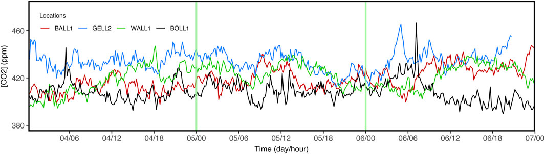 Figure 8. Observed atmospheric CO2 concentration variation from the 4–6 June 2024 in four I-CHANGE Living Labs. Data is presented with 10-min resolution for one station of BALL, WALL, GELL and BOLL. Vertical green lines separate the 3 days.