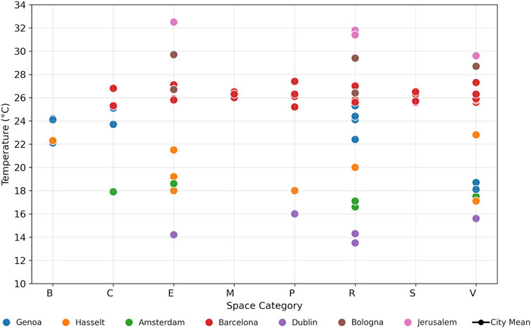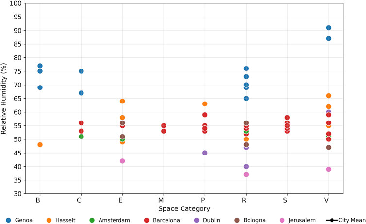 As shown in Figure 9, the atmospheric temperatures measured by LL and space category highlight notable patterns across the different LLs. In Barcelona and Bologna, the mean temperatures across space categories showed minimal variation, less than 2 °C, whereas in Hasselt, Genoa, and Jerusalem, temperature differences between categories were more pronounced. Relative Humidity (RH) data (Figure 10) further indicates that the influence of space category on RH varies by city. Genoa, Hasselt, and Jerusalem exhibited the widest range of RH values across space categories, while RH remained relatively stable between spaces in Barcelona, Bologna, and Amsterdam.