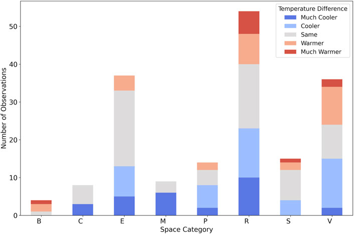Considering the observations across all LLs (Figure 11) by space category, several patterns emerge. In market spaces (M), 67% of respondents reported feeling much cooler than expected. Cultural facilities (C) also exhibited a significant number of responses falling into the much cooler category (38%). Areas with shops (B) stood out, with 50% of respondents feeling warmer and an additional 25% feeling much warmer than anticipated. Green areas and meeting spaces were the most repeated space classification and also showed the highest variability. For green areas, 36% of participants felt cooler, 6% much cooler, 25% the same, 28% warmer and 6% much warmer. Educational (E) and Health related (S) spaces demonstrated a strong alignment with temperature expectations, with over half of respondents reporting that they felt the same as expected (54% and 53%, respectively).