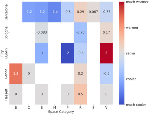 Figure 11. Recorded Citizens’ Temperature expectation vs. in-situ observations. Temperature comparison between expectations and in-situ feeling for the different spaces categories. Blue colors express a cooler sensation than expected (negative numbers) while red colors express a hotter feeling than expected.